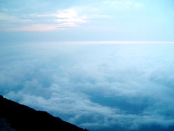 友人との飲み会で急遽富士登山が決定。次の日午後7時にご来光を見ようと意気揚々と甲府を出発。22日夜から23日昼下山の夜間日帰り山行に出かけた。 富士スバルラインを車で登り5合目に着いたのは午後9時。登山客で大いに賑わっていた。さすがシーズンの富士山。こんな時間にもかかわらず、誘導員の方々もまだ働いている。 山小屋が点在し、富士登山を一般的にしている要因だが、日本最高地点に行くのだから装備や心構えには気を付けたい。ご来光を待つ山頂は0℃。普段着で来ている人がいたが、ヘッドライトぐらいは準備しなくては。懐中電灯も持たず雨具も無しで雨に打たれていた人を見かけた時は富士登山の危険性を感じた。当然、物価が高い。水500円、カップヌードル600円を補充してしまう。途中、仮眠をとりたくなるのだが、夜中も山小屋は明るいので脇にツエルトなどをかぶり横になるのも手だろう。 午後9時半に登り始め、山頂に着いたのは5時。ご来光時刻ギリギリと思っていると、ものすごい勢いでまわりは雲一色になってしまった。みんなの願いも届かず、時折かすかに見える米粒程度のご来光だけ拝むことができた。しかし雲海はすばらしく、登って来た甲斐がある。 登りは想像以上にきつく、睡眠不足や渋滞もあったが、コースタイム6時間を大きく超える7時間半もかかってしまう。火口を一周して、最高地点の剣ヶ峰に辿り着いた時は達成感がある。現実的に6時間というのは一般向けだろうか。7合目に宿泊していた旅行会社の団体登山客は午前0時に出発したが、5時に山頂に着いたかどうかである。下りは2時間ちょっと。急斜面を一気に下るため、足腰に疲労がくる。計11時間の5合目ピストンだった。 |