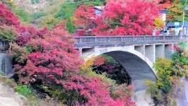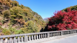 | 大正竣工の長潭橋(ながとろばし)。天神森バス停付近には無料市営や民間の1日1000円駐車場が。紅葉シーズンは大混雑。 | ||