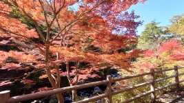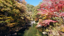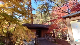 | 綺麗なトイレ。紅葉の中,料亭のような佇まい。ルートの中間地点,「羅漢寺橋」からはエメラルドグリーンの清流渓谷美。 | ||
