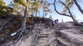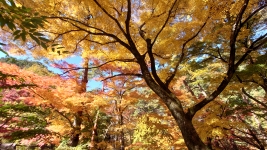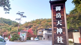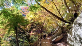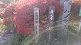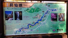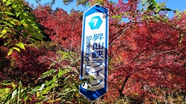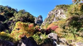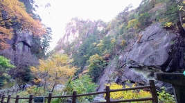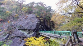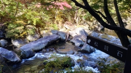 | ルート上は,「松茸石」や「猿岩」など,観光客が楽しむことができるたくさんの看板が。のんびり渓谷と紅葉を満喫。 | ||