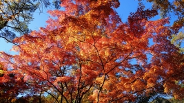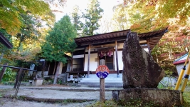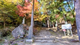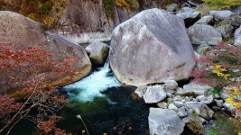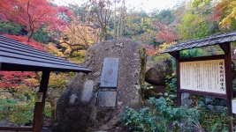 | 渓谷上流部。傾斜も徐々に大きくなる。紅葉と巨石と清流のコラボが美しい。昇仙峡の道を切り拓いた「長田円右衛門の碑」。 | ||