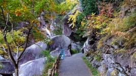 | 「石門」。遊歩道に巨大な岩石が覆いかぶさるワクワクポイント。「昇仙橋」を越えると渓谷最奥部へ。 | ||