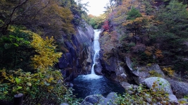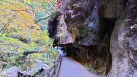 | 橋を渡ると遊歩道は石のトンネルへ。ここを抜けると,いよいよクライマックスの「仙娥滝(せんがたき)」。しばらく余韻に浸る。 | ||