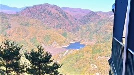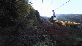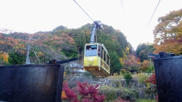 | ロープウェイで羅漢寺山へ。車内は通勤満員電車並みのすし詰め状態。上りは紅葉の山肌。下りは荒川ダムの絶景が。 | ||
