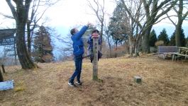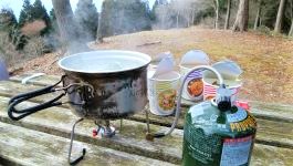 | 山頂はこんもりとした芝生。大勢の人が休憩できるだろう。テーブルやベンチが設置してあり,昼食をとるには最適である。シーズン中は人気であろうこの山も今日は誰もいない。南アルプス山系の山々が眺望できる。 | 山で食べるカップラーメンは最高。ファミリーハイクの定番。お弁当もいいが,まだまだ肌寒いので,温かい食べ物や飲み物がほしい。水場はないので,ザックいっぱいに水を担いでいく。贅沢に使うことができる水が一番大切。 | 山頂からは富士山が眺められる…はずである。ちょうど富士山を雲が包んでしまった。明日は雨予報。そういう時は富士山は雲で隠れてしまったり,笠がかかってしまったり。山梨県民の自然天気予報である。 |