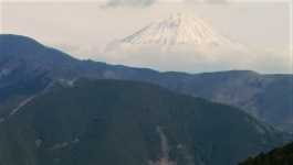 | 峠からの眺望はなかなかのもの。少し距離があるが富士山の西側面である。目の前にある山々は毛無山方面の山だろうか。その向こうに朝霧高原があるのだろう。この山が南アルプス山系ではなく,富士御坂山系の理由がよくわかる。 | 佐野峠が鞍部にあるので,登山口から尾根に取りつくと,まずは急な登りである。東海自然歩道の一部というだけあり,整備されている。丸太の階段が急な登りでは邪魔だが,下山では足の置き場として助けてくれる。 | すぐに標高を稼いでいくことができる。見下ろすと駐車場が遠のいていくのがよくわかる。車は我が家を含めて3台。途中で3組とすれ違う。2組が車の持ち主だとすると,どうやら単独行の男性が装備からして縦走中なのだろう。 |