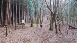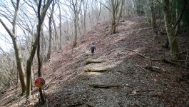 | 急な尾根を15分ほど登り終えると,なだらかな稜線歩きになる。いかにも低山ハイクな雰囲気で気持ちいい。3月初めだが,10℃ある。峠から山頂までは標高差約186m。ほどよいアップダウンを繰り返していく。 | 登山道も標識もしっかり整備されている。東海自然歩道の一部という理由もあるだろうが,地元の方々がこの山を大切にしていることがわかる。南部町は他にも7山をハイキングコースとして観光ガイドブックに載せいている。 | 山頂へ。木に囲まれた稜線から見上げると,山頂の光が幻想的。40分のタイムコースだが,のんびり歩きで1時間程度かかった。佐野峠と山頂は5月中旬・7月下旬にダイヤモンド富士を拝むことができる。 |